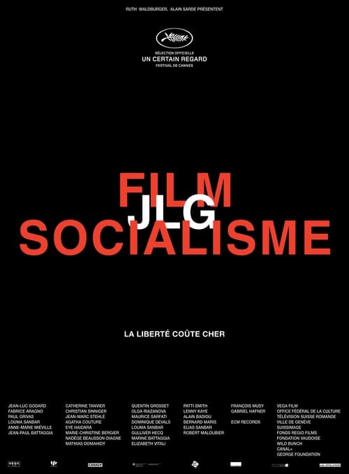 Film Socialisme (2010) - "Film Socialisme" es una sinfonía en tres movimientos. "Cosas así": en un crucero por el Mediterráneo viajan personajes muy diversos entre los que tienen lugar numerosas conversaciones: un policía de Moscú, un criminal de guerra, un filósofo francés (Alain Badiou), una cantante norteamericana (Patti Smith), un embajador palestino y un ex doble agente. "Nuestra Europa": una noche, una niña y su hermano pequeño convocan a sus padres ante el tribunal de su infancia y les piden explicaciones sobre la libertad, la igualdad y la fraternidad. "Nuestras humanidades": visita a seis lugares que son escenario de leyendas auténticas y falsas, Egipto, Palestina, Odessa, Hellas, Nápoles y Barcelona..
